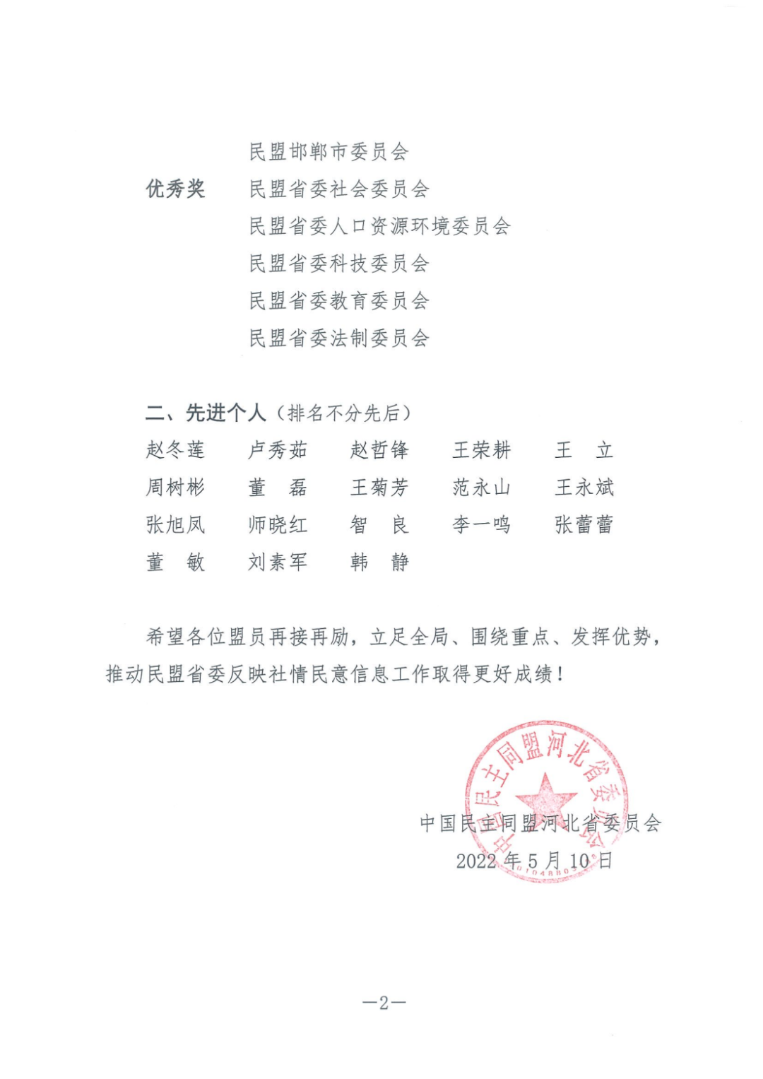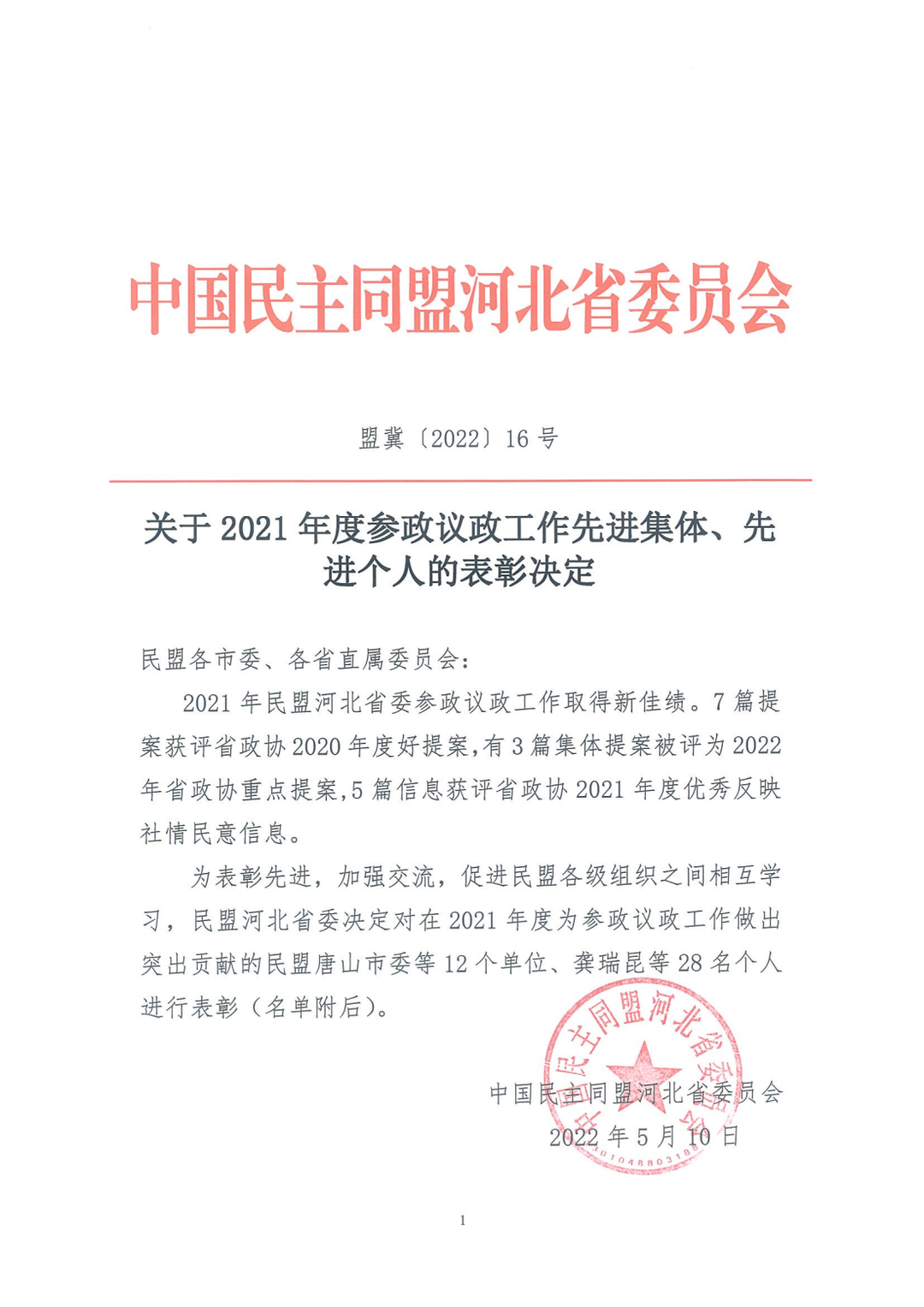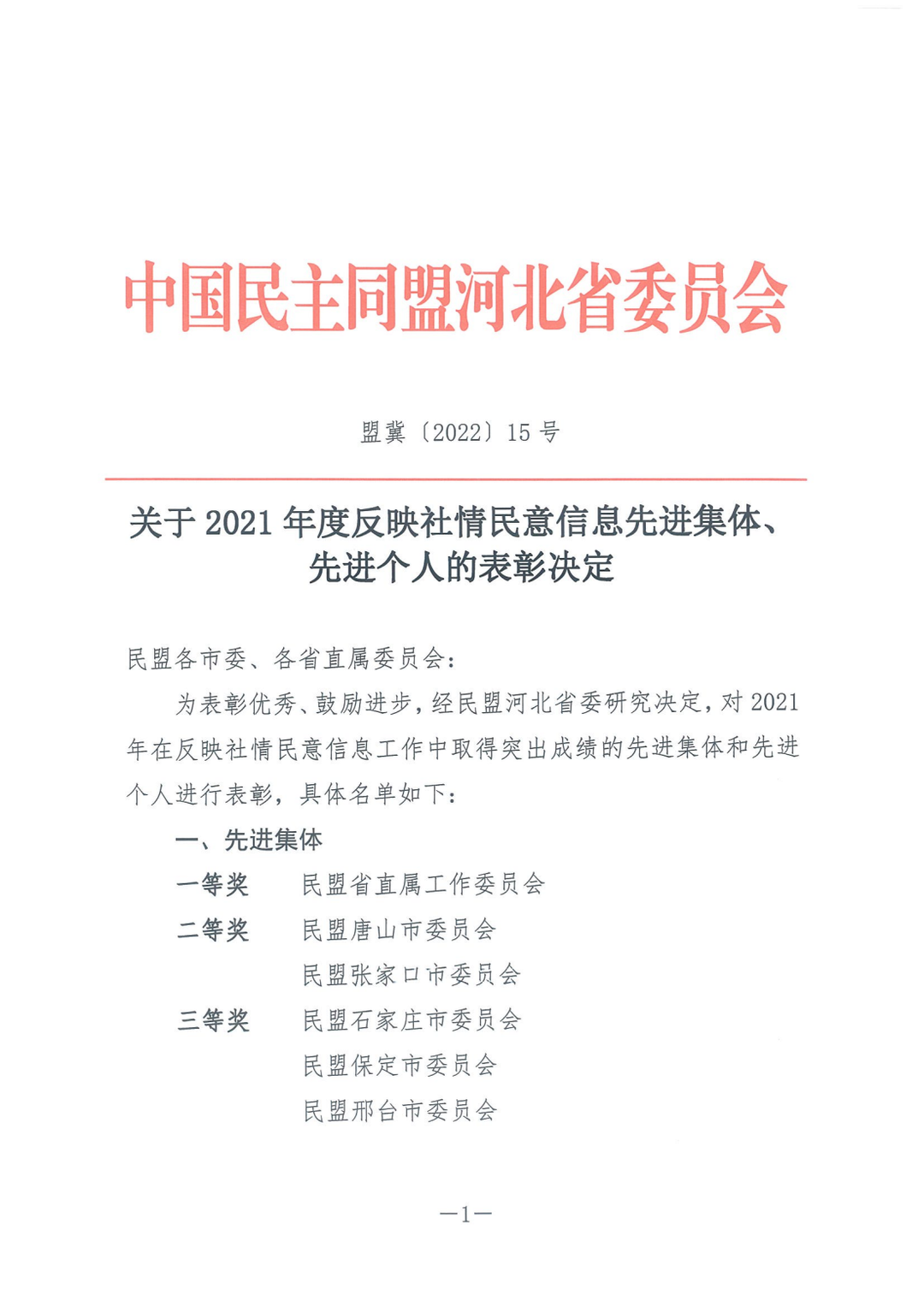2022年5月18日,民盟省委反饋:民盟張家口市委榮獲民盟河北省委2021年參政議政工作先進(jìn)單位、反映社情民意信息先進(jìn)集體二等獎(jiǎng);安定明榮獲參政議政工作先進(jìn)個(gè)人,師曉紅、張旭鳳榮獲反映社情民意信息先進(jìn)個(gè)人。